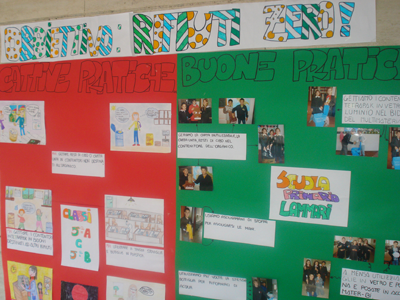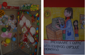 Il messaggio in bottiglia consegnato agli alunni riguarda due buone pratiche da adottare. Una riguarda l’utilizzo di una borraccia personalizzata per evitare i contenitori plastici o in tetrapak per bevande come i succhi di frutta, yogurt ecc. l’altra l’utilizzo di piccoli asciugamani con il nome ricamato sopra per evitare il consumo di carta tissue per asciugare le mani. Per gli operatori scolastici sono state individuate altre due buone pratiche come quella dell’utilizzo fronte retro delle fotocopie e dell’uso di macchine del caffé alternative alle capsule usa e getta ricorrendo o alla moka o a sistemi di macinatura del chicco.