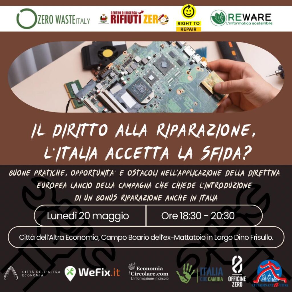 Appuntamento a lunedì 20 maggio a Roma, presso la “Città dell’Altra Economia”, Campo Boario dell’ex-Mattatoio in Largo Dino Frisullo, dalle ore 18:30 alle ore 20:30, per discutere ed elaborare la bozza di una proposta di legge (sul modello di quelle già esistenti in Svezia, Austria, Francia e in diverse regioni tedesche) per “mettere a terra” l’alternativa all’ usa e getta e lavorare nel solco sempre più pressante degli impegni normativi UE al fine di incentivare la riparabilità di beni e prodotti consentendone la riusabilità e l’allungamento del loro ciclo di vita.