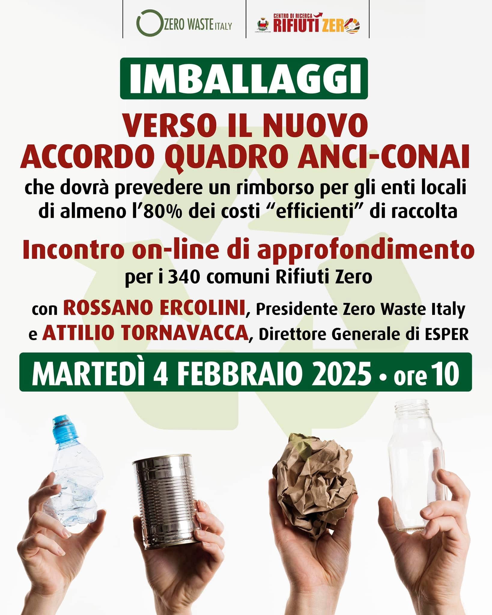 Il 4 febbraio alle ore 10 si terrà un importante incontro nazionale online che coinvolgerà i 340 Comuni Rifiuti Zero italiani, promosso da Zero Waste Italy e dal Centro di Ricerca Rifiuti Zero di Capannori. L’evento rappresenta un momento chiave per discutere l’accordo ANCI-CONAI sulla gestione degli imballaggi, in vista della sua scadenza prorogata a giugno 2025, e per approfondire le strategie per una gestione dei rifiuti sempre più efficace e sostenibile.